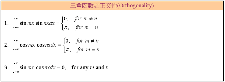 而对于函数,数学家也发现同样的现象,使用无数个相互正交的函数可以近似的表示任意一个周期函数,问题是这无数个两两正交的函数怎么找呢,三角函数刚好完美支持,而傅里叶级数选取的这个基函数就是三角函数,事实上,傅里叶级数可以有多种变化方式,三角函数只是其中一种。三角函数的正交性: