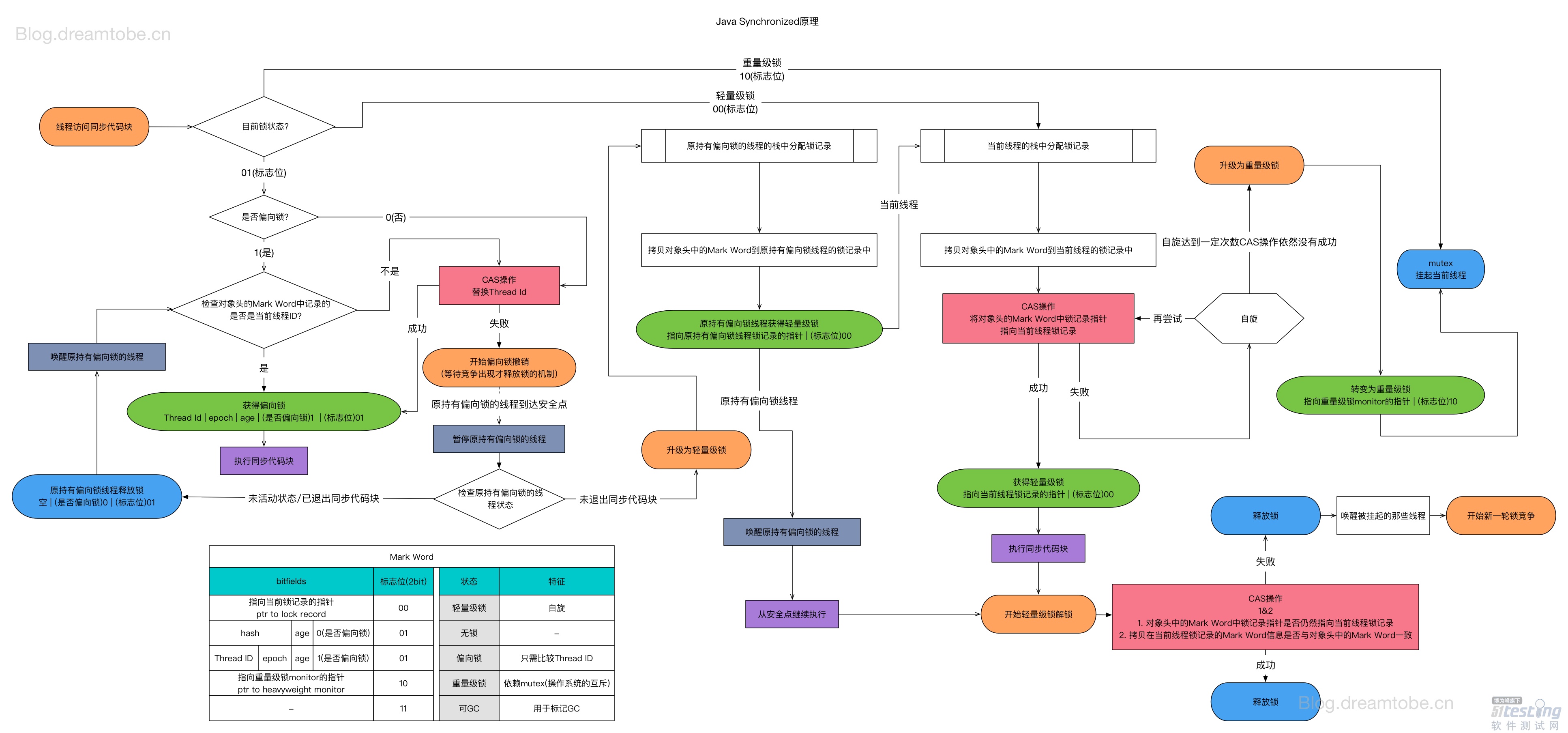 通过这两段描述,我们应该能很清楚的看出Synchronized的实现原理,Synchronized的语义底层是通过一个monitor的对象来完成,其实wait/notify等方法也依赖于monitor对象,这就是为什么只有在同步的块或者方法中才能调用wait/notify等方法,否则会抛出java.lang.IllegalMonitorStateException的异常的原因。
